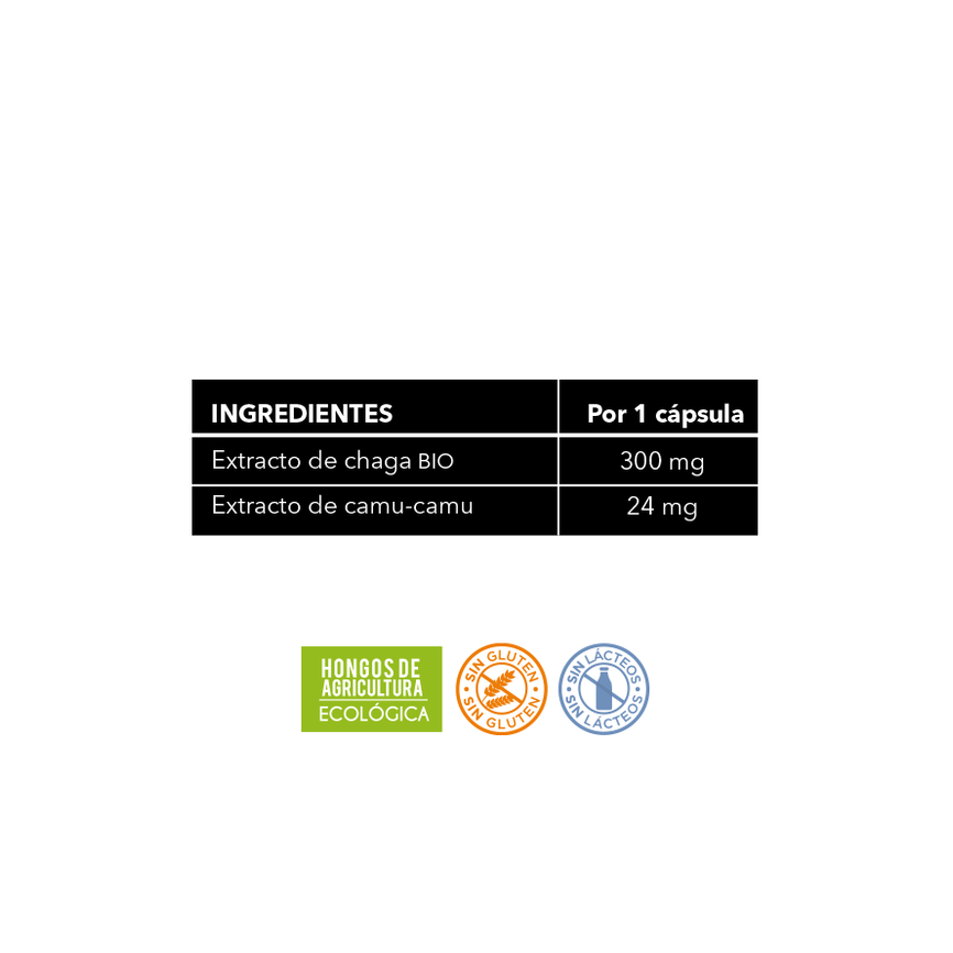 Composición:Extracto seco de chaga (Inonotus obliquus) estandarizado al 20% en betaglucanos, 2% en triterpenos y 5% en polifenoles 300 mg, agente de carga (celulosa), agente de recubrimiento vegetal (hidroxipropilmetilcelulosa), estabilizante (hidroxipropilmetilcelulosa), extracto de camu-camu (Myrciaria dubia) estandarizado al 50% en vitamina C 24 mg, Agente de carga (xilitol).