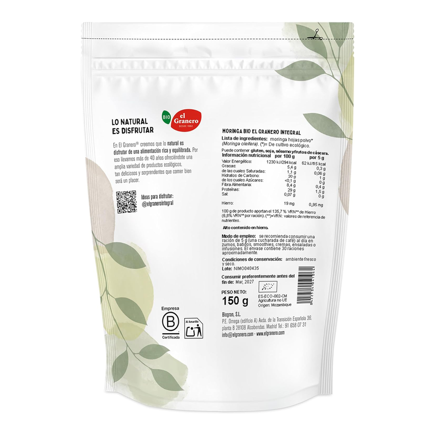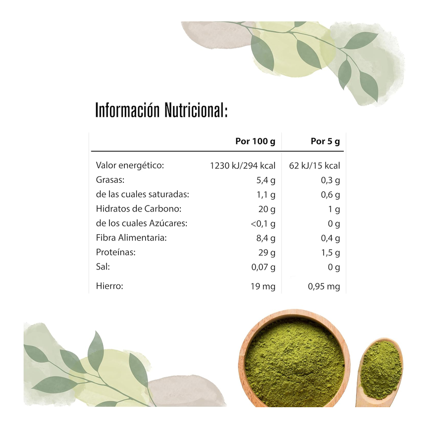 - INGREDIENTES NATURALES: Elaboramos este producto a base de hojas de moringa oleifera en polvo. La obtenemos a partir de cultivos procedentes de agricultura ecológica.