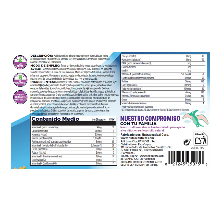 Multivitaminico y mineral en comprimidos masticables en forma de dinosaurios con edulcorantes. La vitamina D es necesaria para el crecimiento y el desarrollo normales de los huesos en los niños.