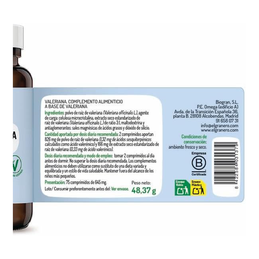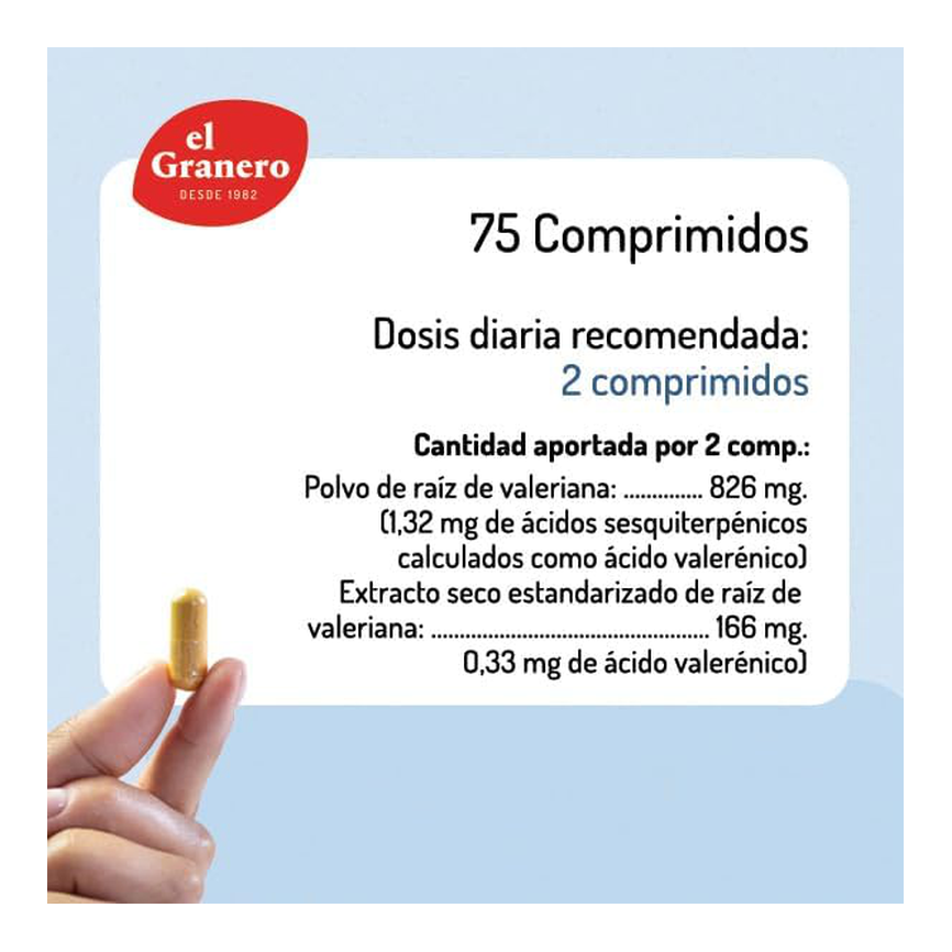 Composición:Polvo de raíz de valeriana (Valeriana officinalis L.) con un 0, 16% de ácidos sesquiterpénicos calculados como ácido valerénico, agente de carga celulosa microcristalina, extracto seco estandarizado de raíz de valeriana (Valeriana officinalis L.) con un 0, 2% de ácido valerénico, maltodextrina y antiaglomerantes estearato magnésico y dióxido de Silicio.
