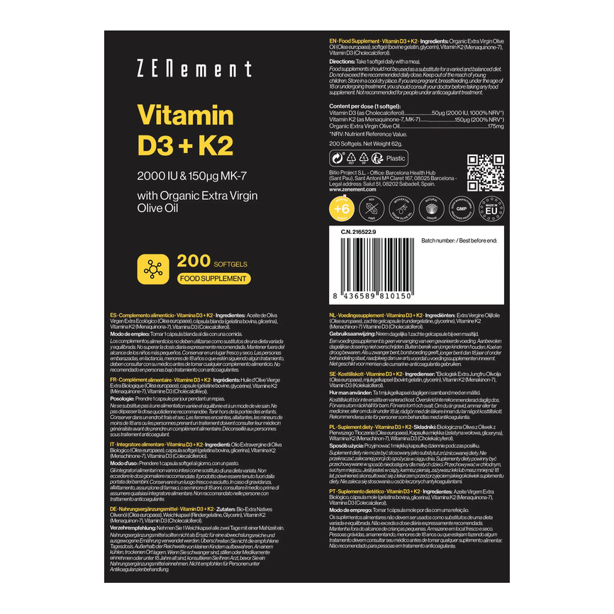 VITAMINA D3 + K2 COLECALCIFEROL (2000 UI) y MK-7 (150 mcg) 200caps. ZENEMENT